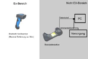 The exchange of data between hand-held scanner and base station works via Bluetooth connection. The base station is only for the use outside the hazardous area to load the scanner.